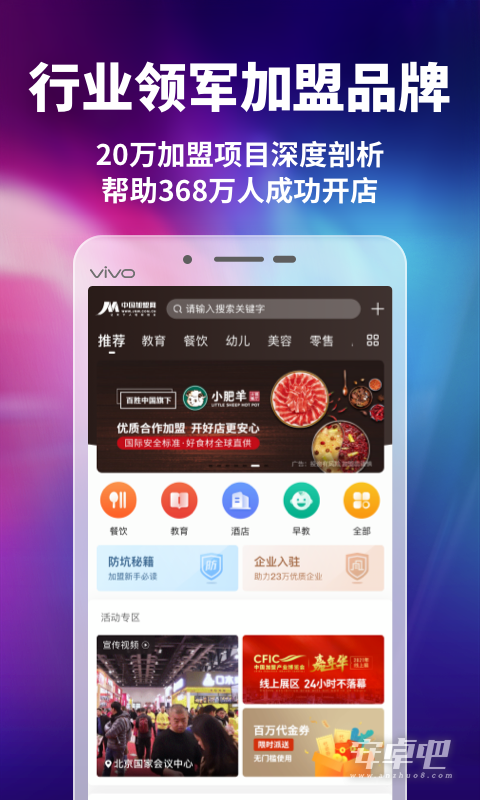 3、餐饮、教育、服装、家居、珠宝、美容等30大传统热门加盟行业,云集火锅、快餐、一对一辅导、幼儿早教、机器人教育、鸡排、英语培训、奶茶等时下热门开店项目,满足您个性化的投资需求