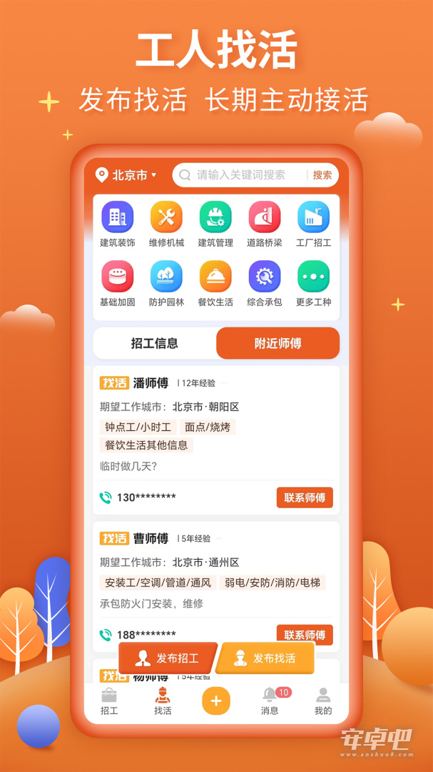 2、点击求职找活,可查看最新发布的工人找活信息,有需求可以电话联系师傅;