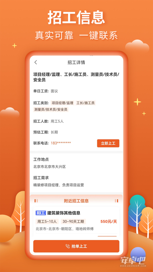 2、用户可以通过软件获取海量的同城岗位信息。包含了各行各业,像是建筑工、装修工、安装工、维修工、钟点工等,大家可以轻松找到符合自己工作。在线就能和招聘方交流,轻松实现求职者和招聘方的快速沟通,提升了双方的效率