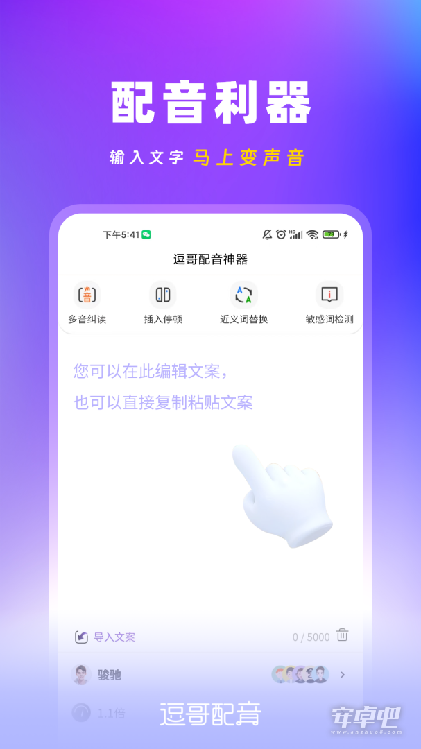 逗哥配音神器专注于短视频创作需要的配音领域,内涵多个版权声音,用户输入文字或者输入语音,即可秒生成专属好听的声音,可选配音员有几十个抖音爆款配音员。