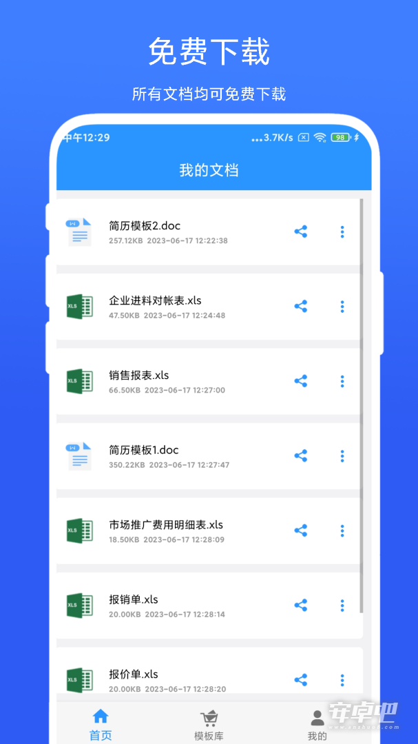 全能办公模板是一个办公模板文件共享app,用户可以通过此app搜索常用文件模板,支持常用办公模板文件,如:word、ppt、excel等。另外,软件也支持上传模板到共享市场 ,然后下载即可使用。审核通过后,其他用户也可以下载使用。