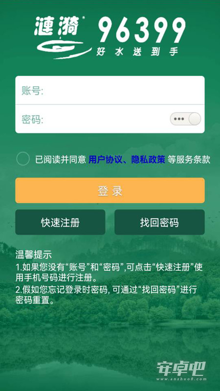 1、下载安装涟漪饮用水,然后注册或登录您的账号。