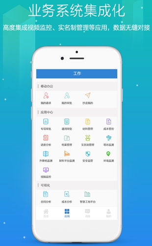3.在软件的应用中心界面中,为用户提供了专项审批、调用审批、材料管理、成本管控、速度分析、档案管理、实名制管理、塔吊监测、升降机监测、卸料平台监测、安全监管、环境监测、视频监控等等的功能,用户可以根据自身的需要对于各种的功能进行选择使用。